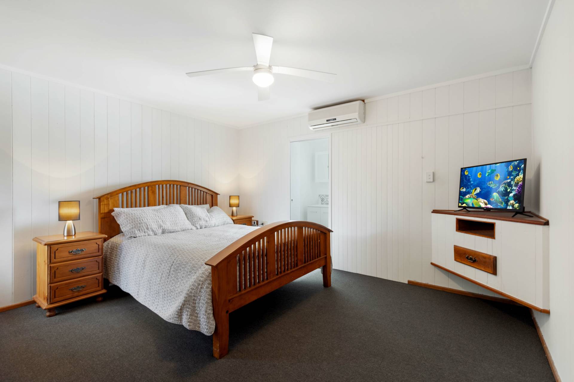 Master bedroom contains a split system air conditioner, ceiling fans and doors leading to the outside verandah.