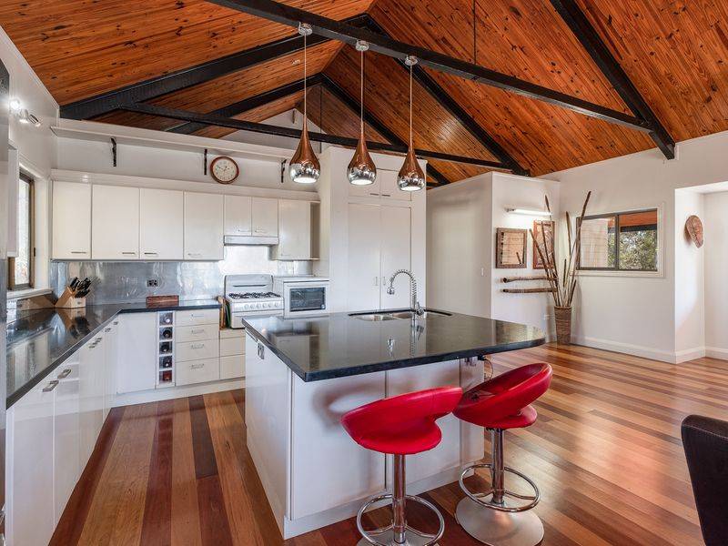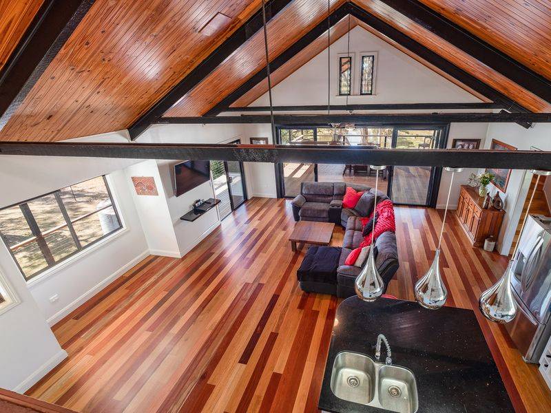 Combined open plan kitchen, living, dining with hardwood timber floors, cathedral ceilings with fans.