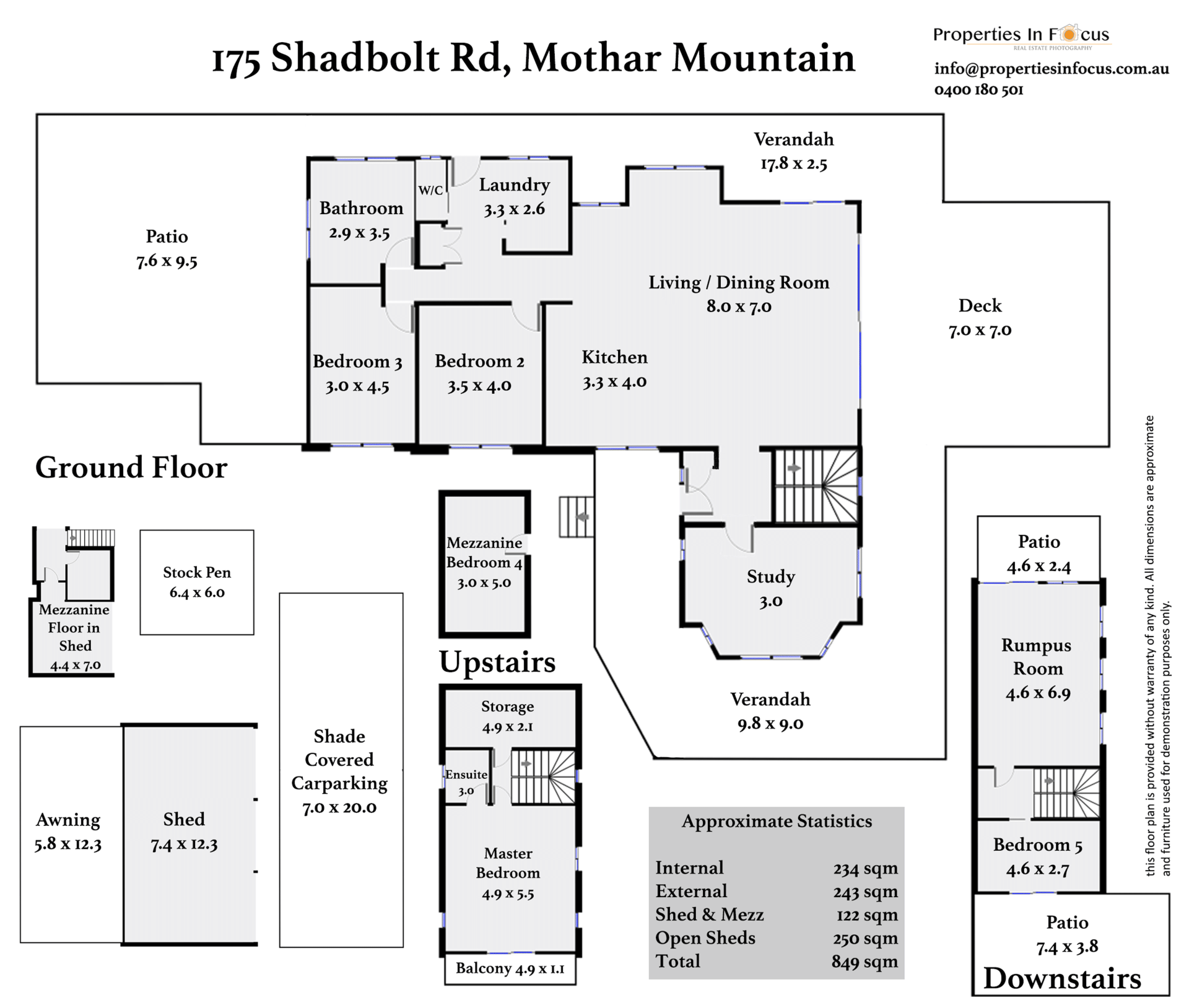 1 x 6 bay carport, 1 x 3 bay shed with mezzanine floor ideal for office space and 1 x 4 bay shed all with electricity.