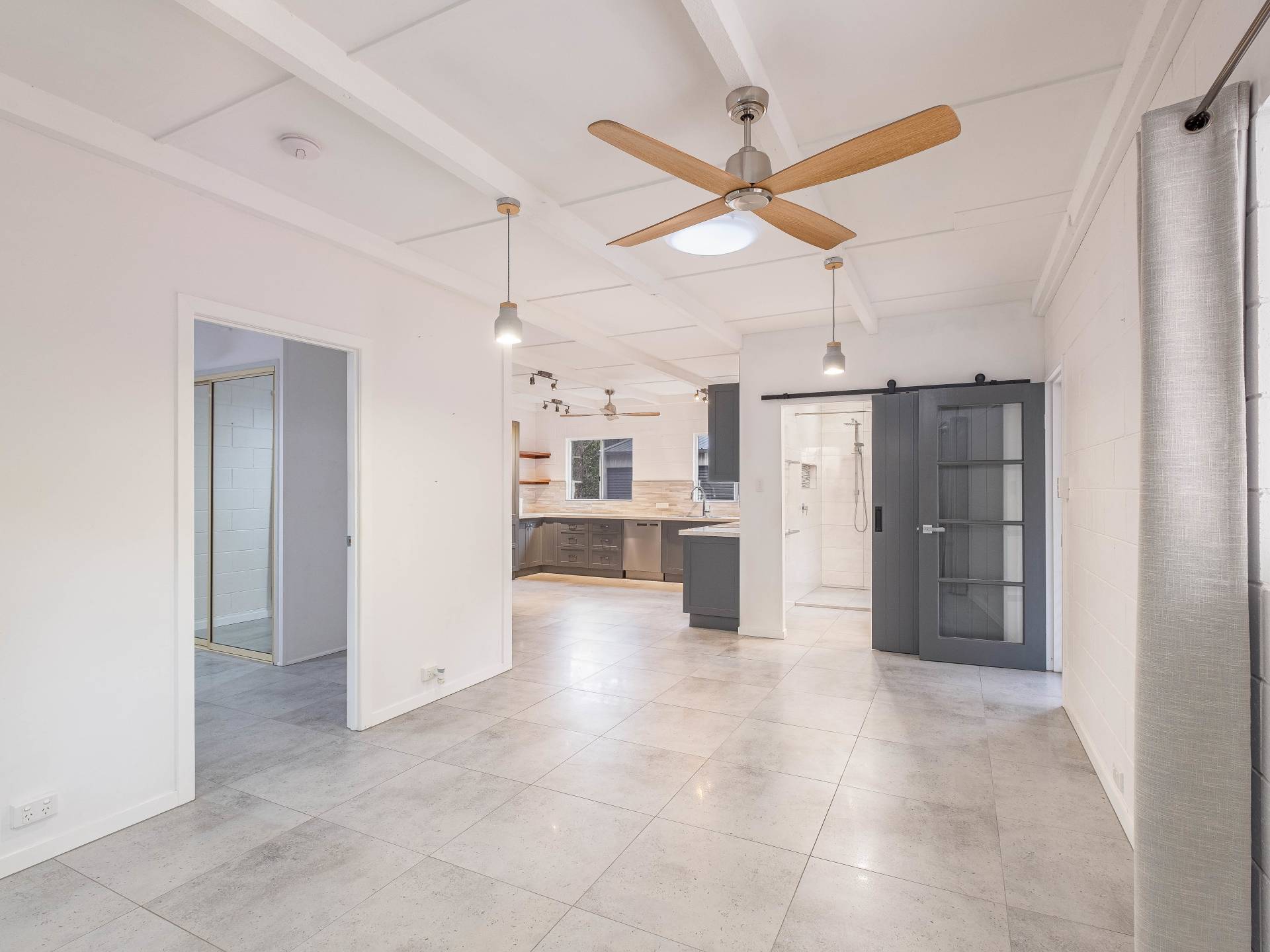 The main bathroom has a large double walk-in shower with a double vanity, toilet all renovated with modern colours.