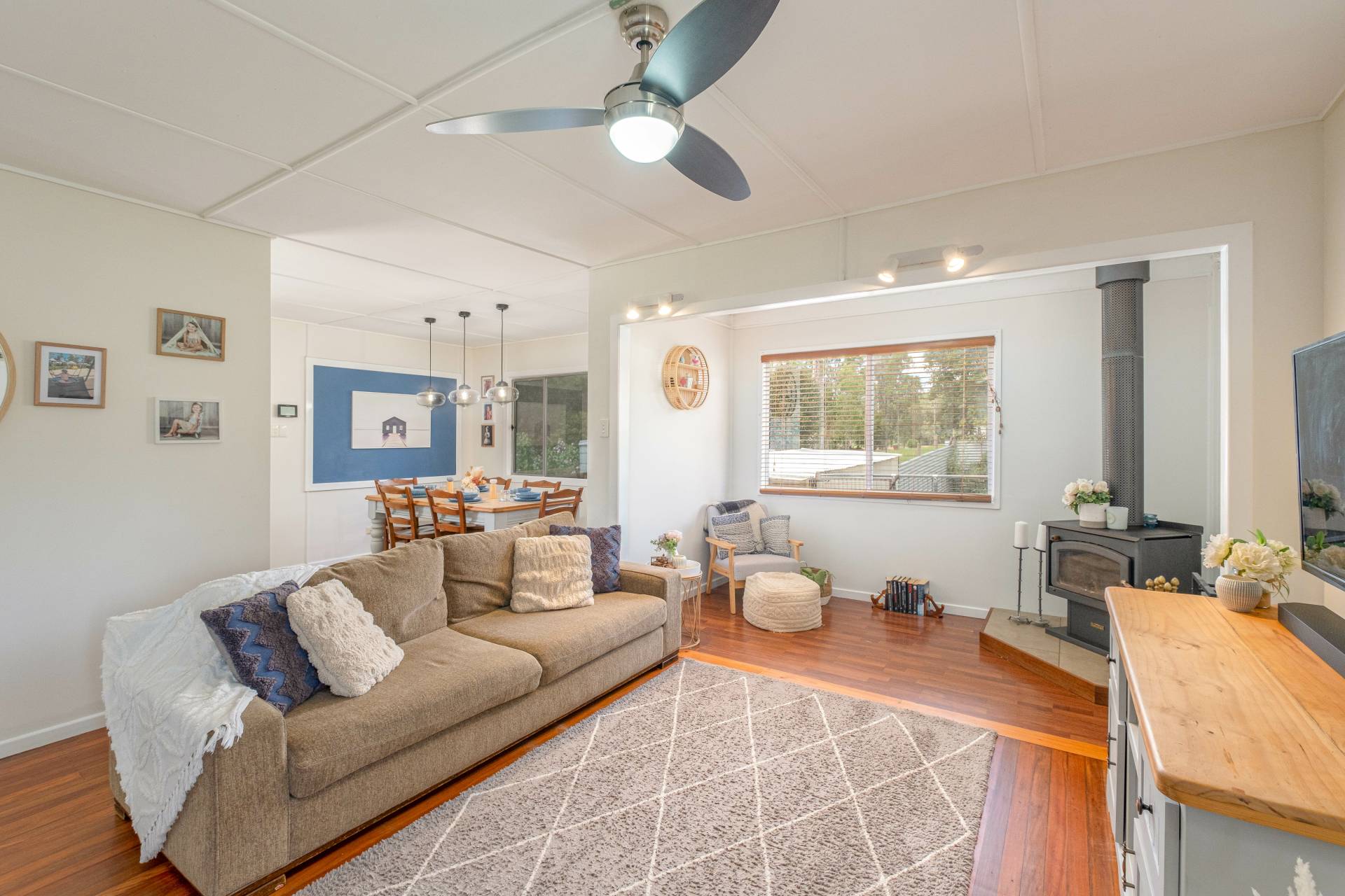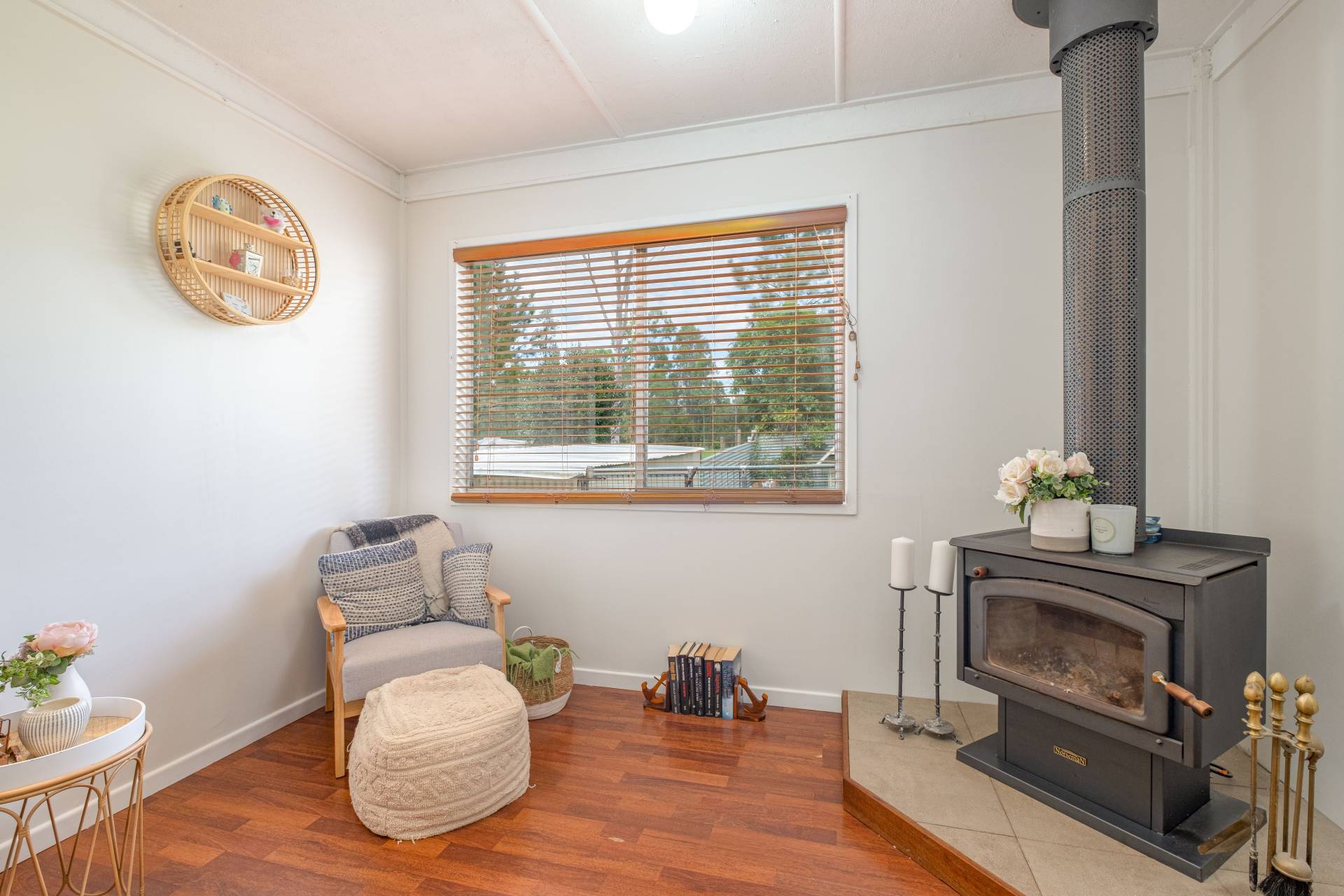 Perfectly positioned wood burner fireplace. Polished timber floors with modern wood laminate in kitchen and tiled bathroom.