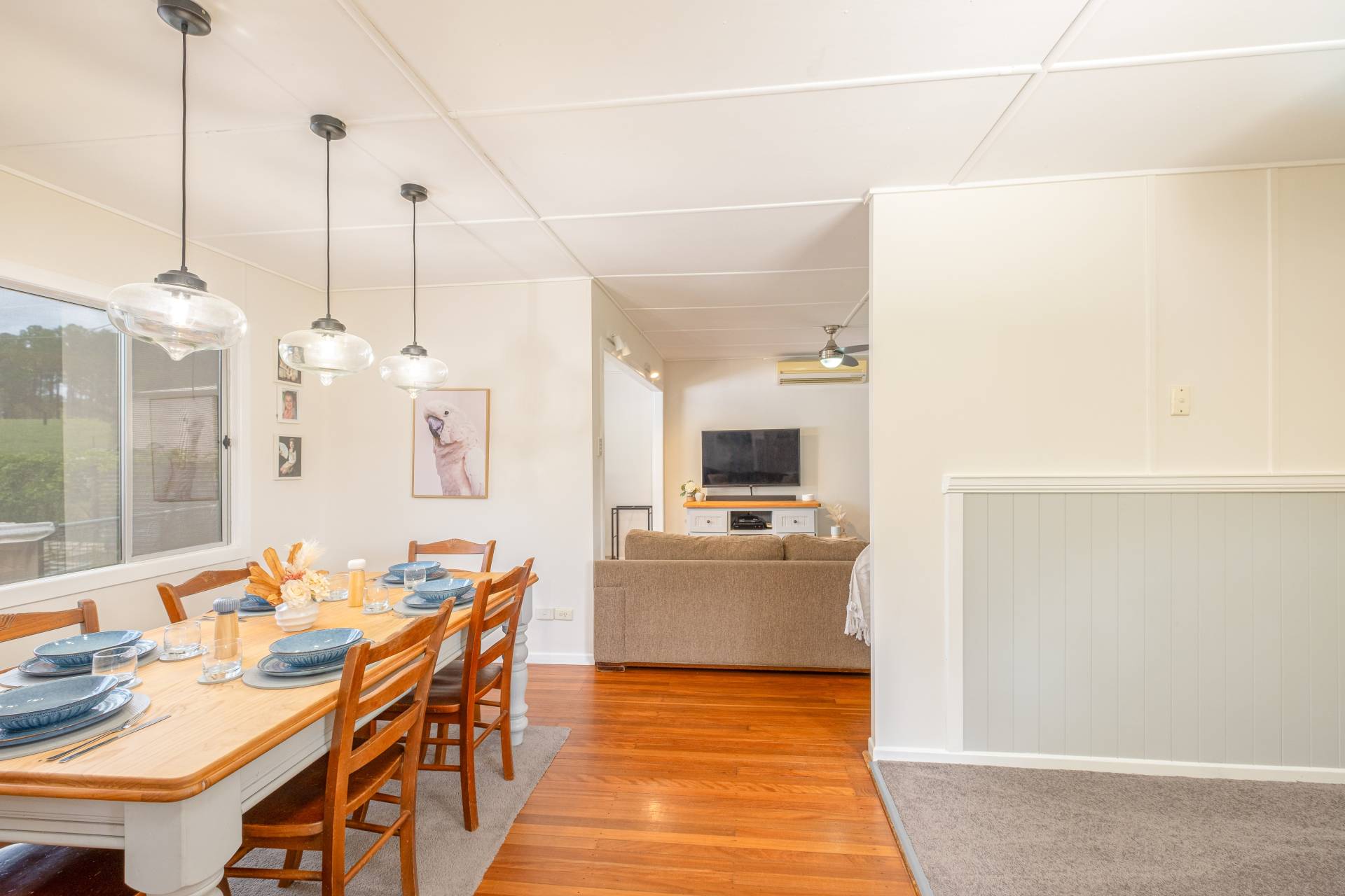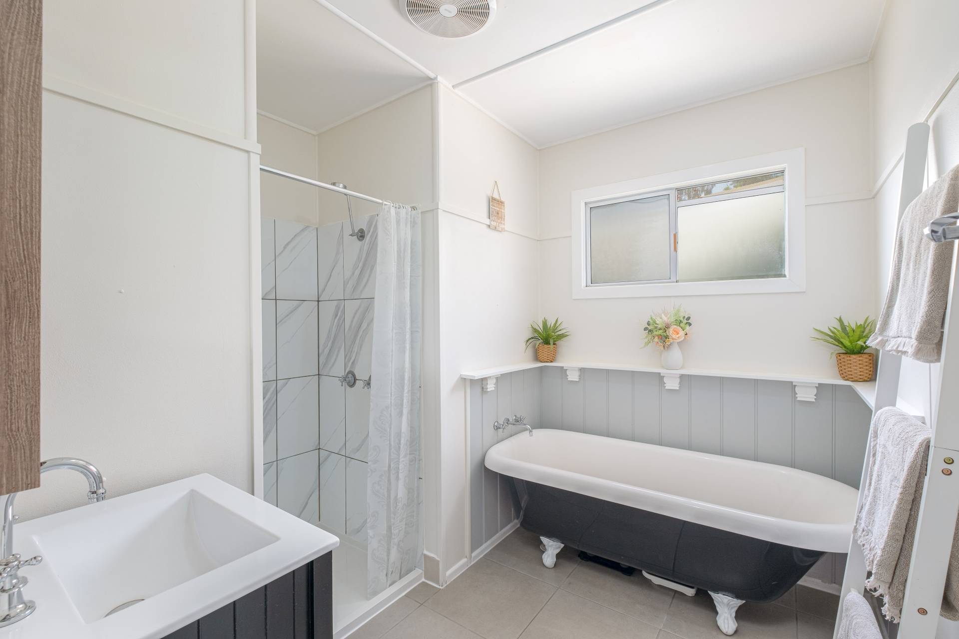 Renovated bathroom with beautiful claw bath and separate shower. Open plan living dining area with ceiling fans and spilt system air conditioning.
