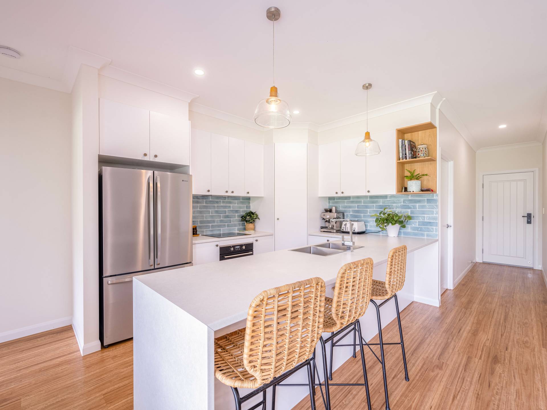 - Stylish kitchen houses an electric oven cooktop, dishwasher, pantry and a breakfast bar.