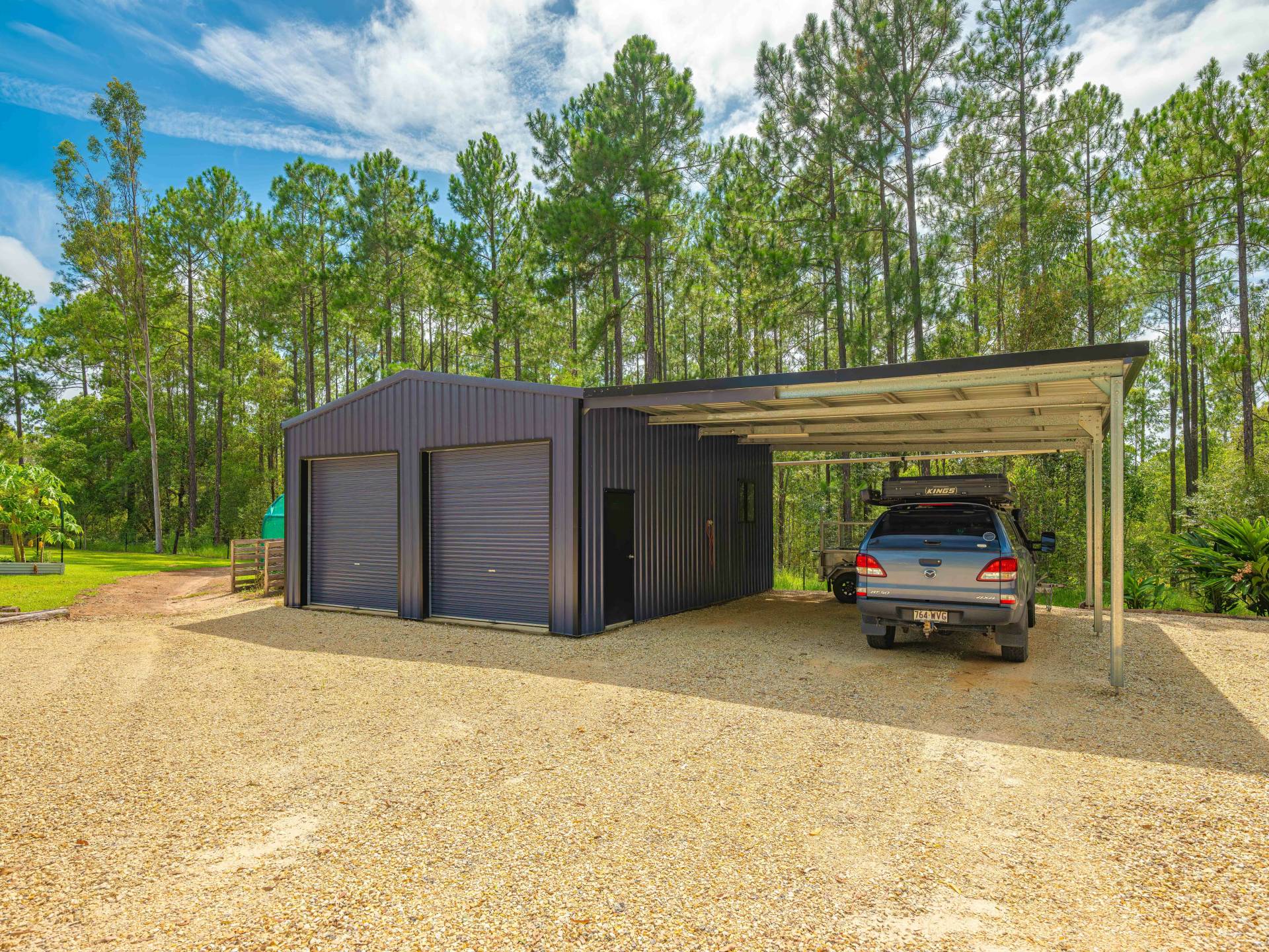 8m x 7m shed with power and two roller doors, as well as an additional 2 bay car port.