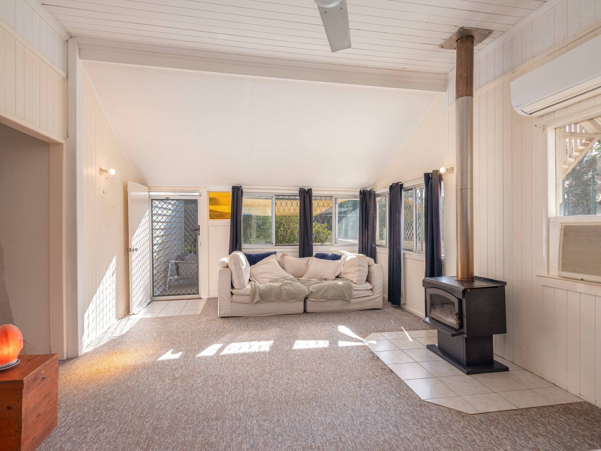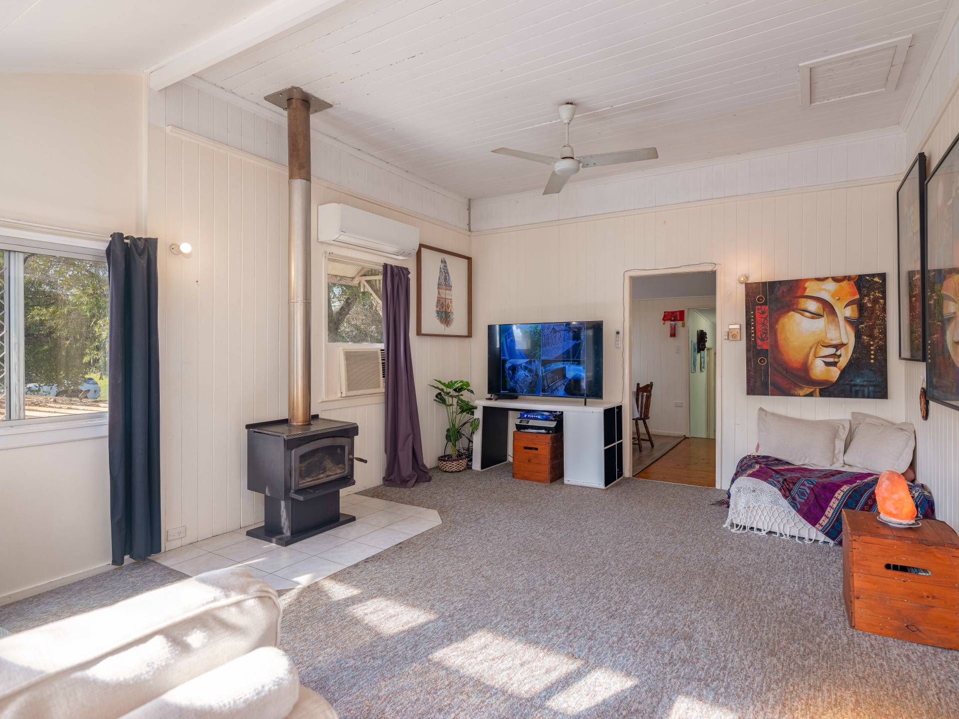 • Ambiance meets practicality with ceiling fans and a warming wood burner, adding cozy appeal and character to the living space.